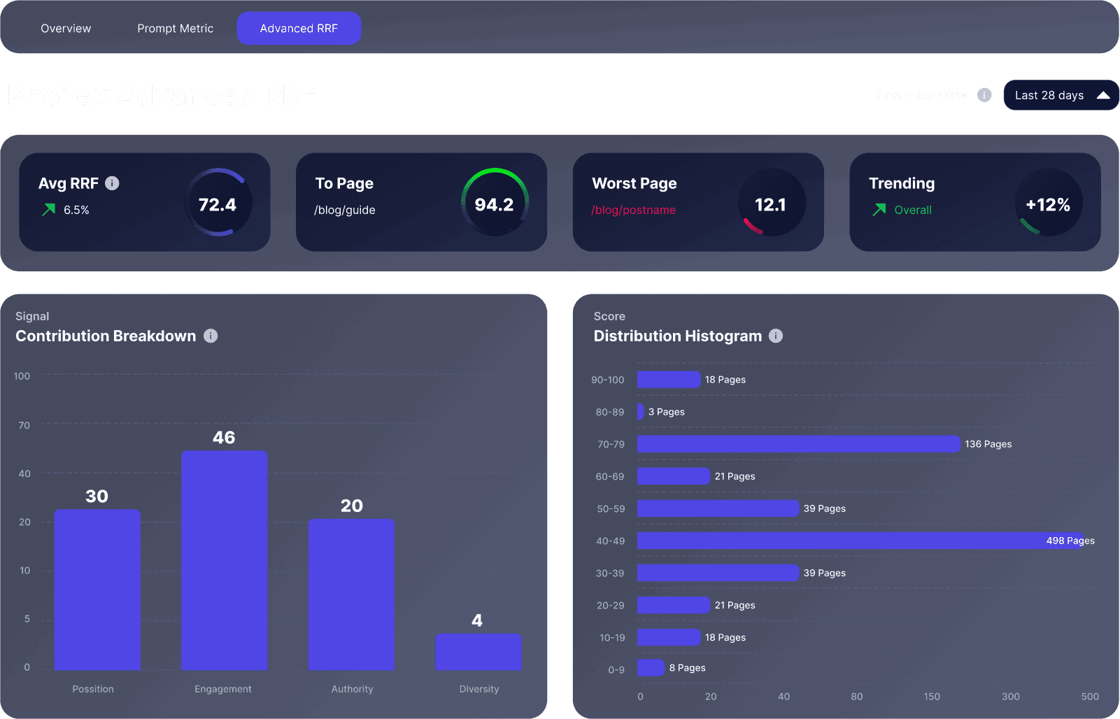 The Advanced RRF section measures how your brand performs across AI systems by combining multiple ranking signals into one unified score.