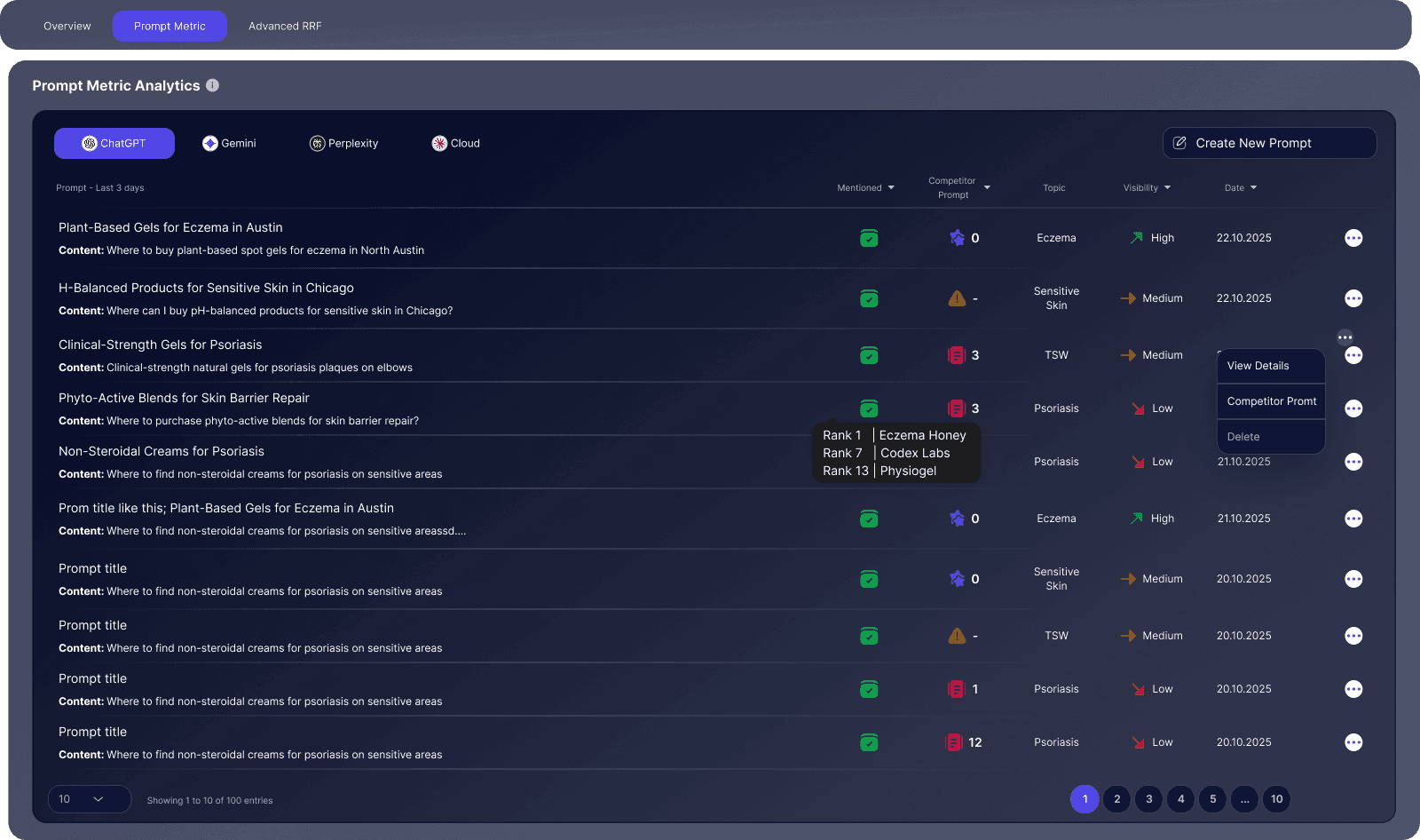 The Prompt Metric page helps you understand how and where your brand appears in AI-generated answers.