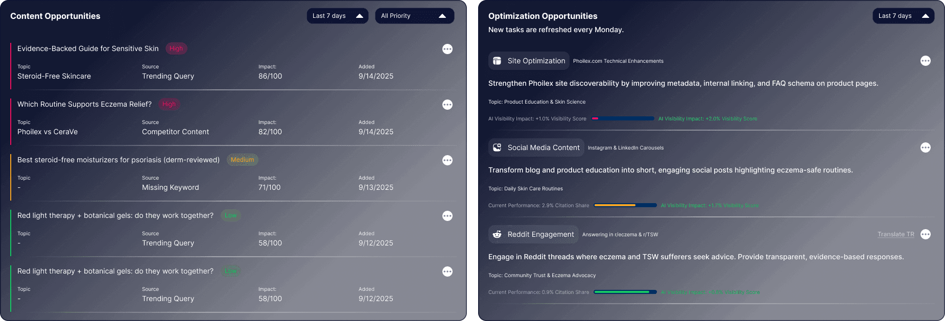 (Example: “Add a blog post for sustainable skincare routines — 0% brand mentions detected.”)